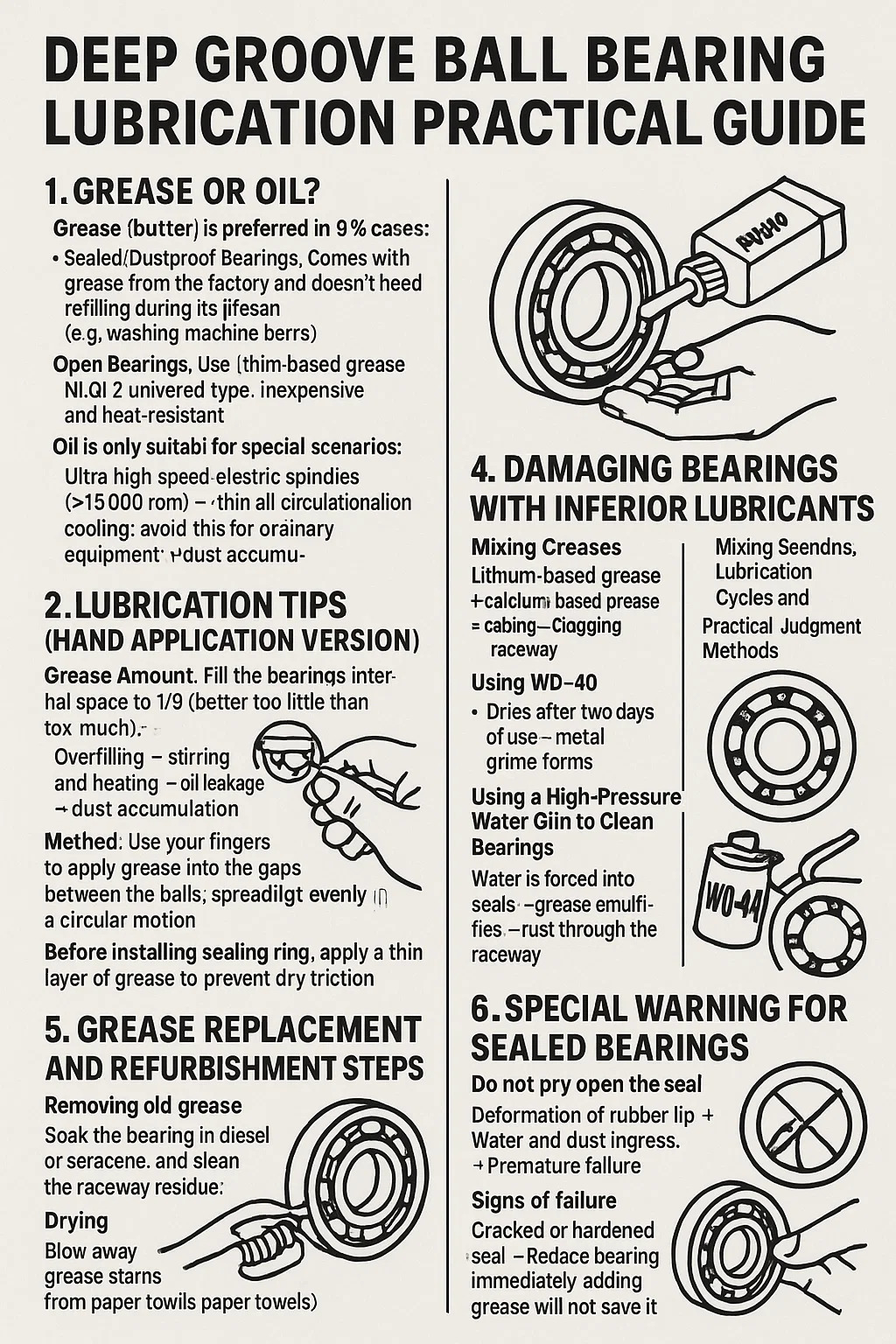 Repedt vagy megkeményedett tömítés → Azonnal cserélje ki a csapágyat; zsír hozzáadása nem menti meg.