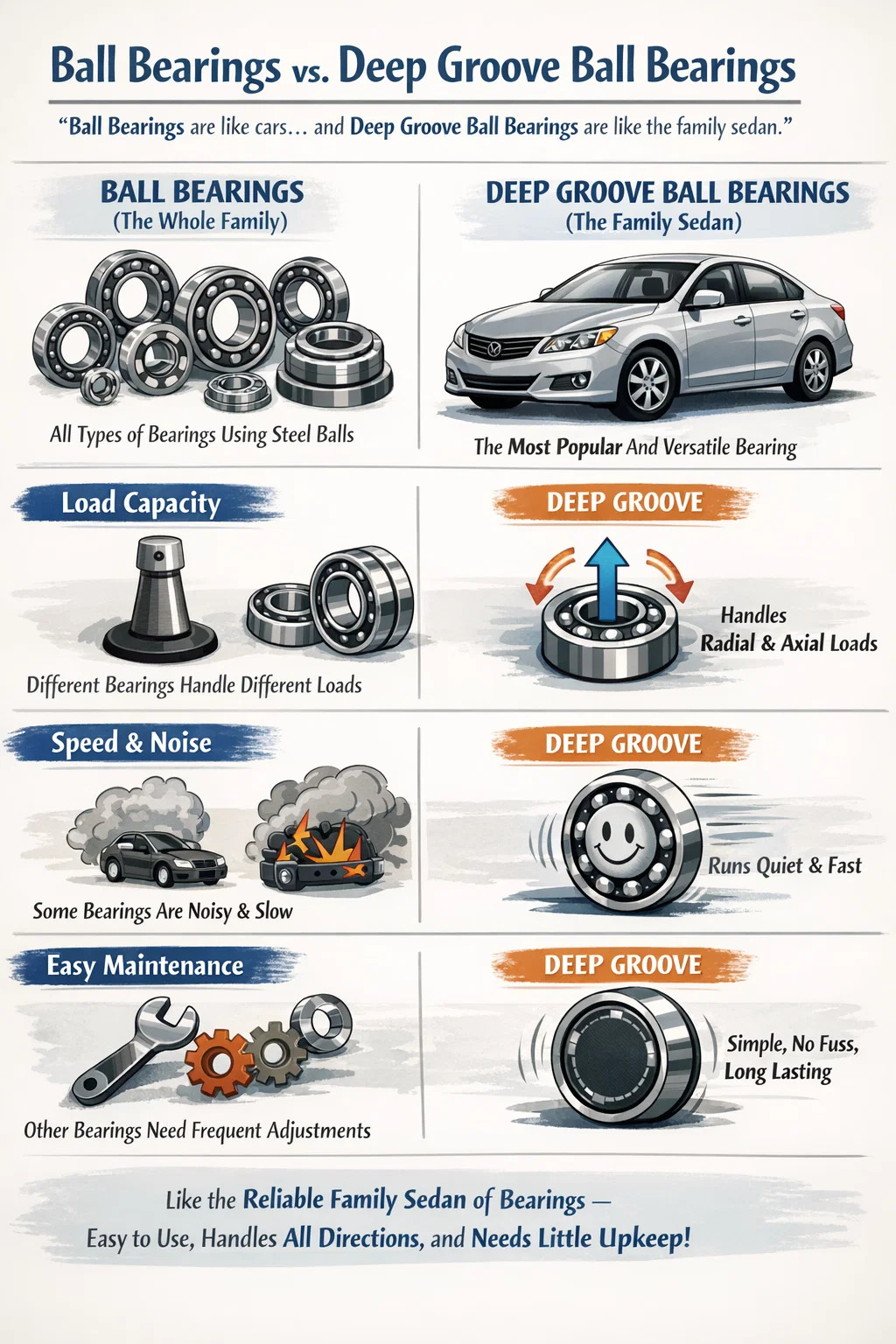 Egyszerűen fogalmazva, a golyóscsapágyak egy általános kifejezés egy nagy "családra", és a mélyhornyú golyóscsapágyak a család leghíresebb és legszélesebb körben használt "tagjai".